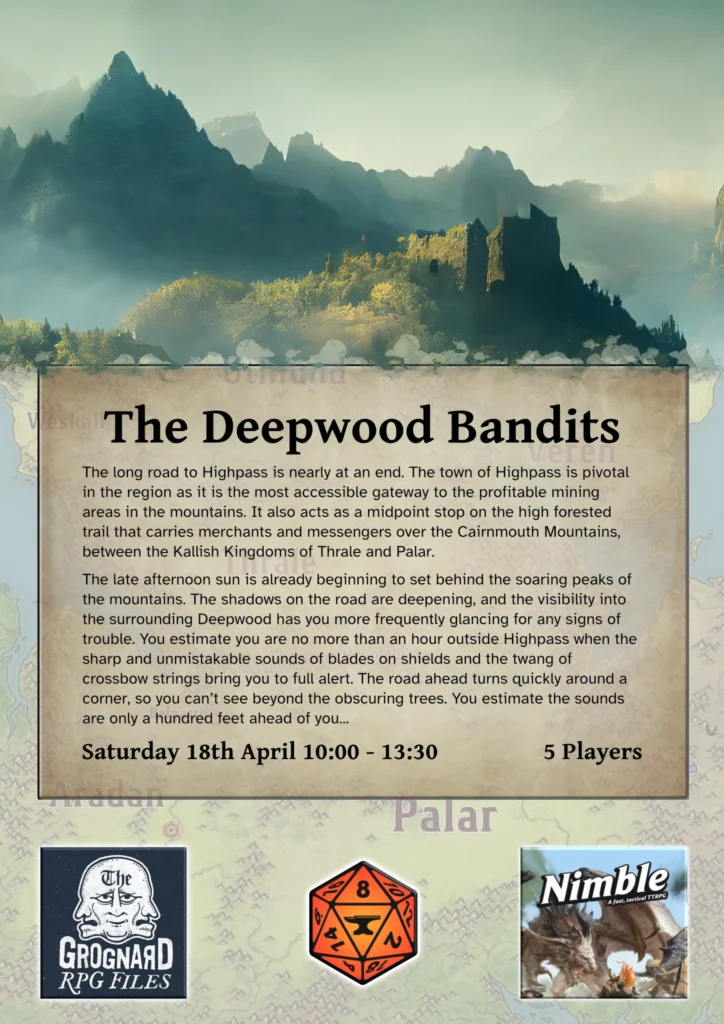 One of the advantages of Nimble is the simplicity of conversion/substitution from existing D&D and adjacent adventures. I just grabbed something appealing that came with some useful looking VTT maps. Before long I had The Deepwood Bandits ready to go.
